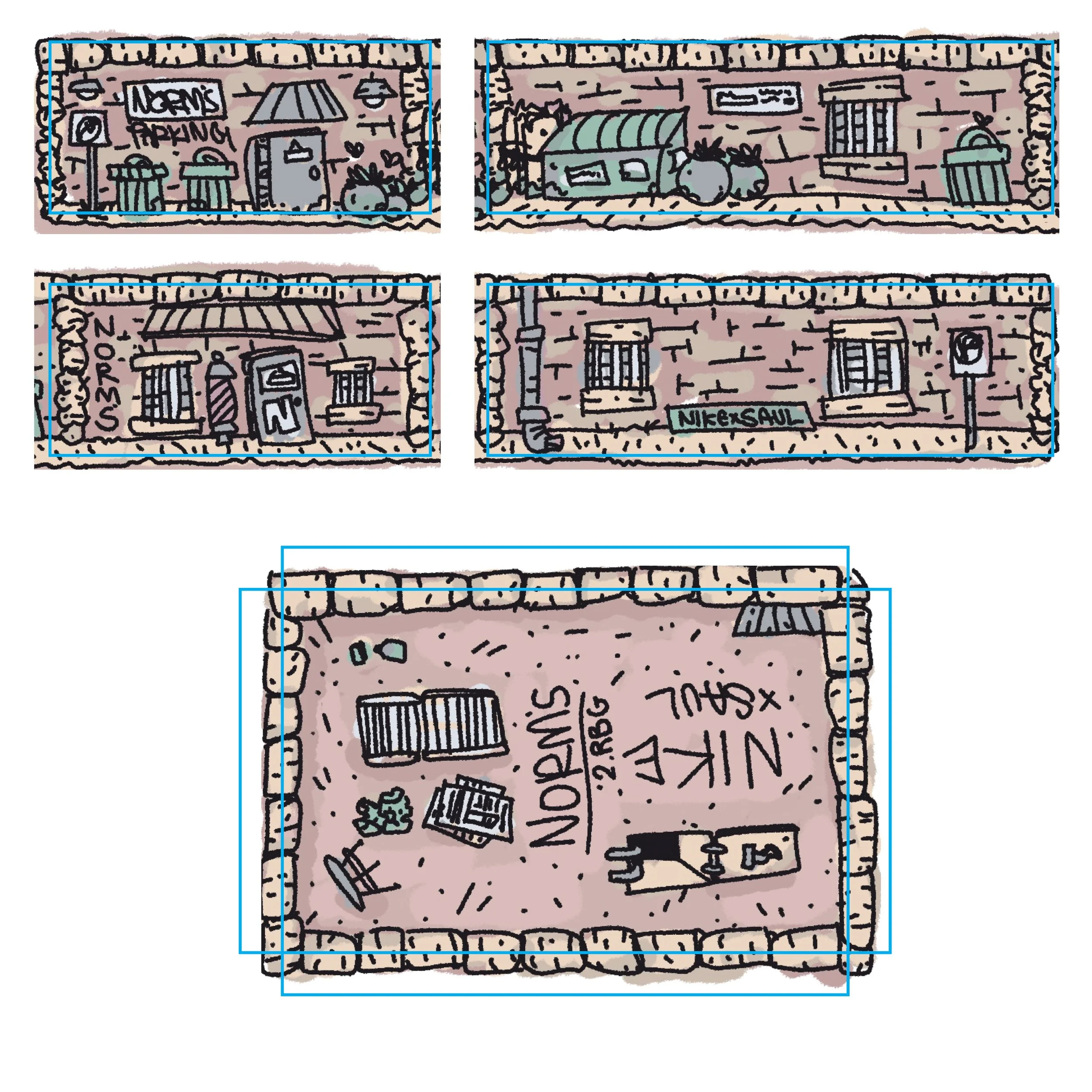 Created original hand drawn artwork for each side of the shoebox as well as the lid. This was a fun project because I was able to combine my layout design skills with my artistic ones. Below you will see a few of the steps I used throughout the project.